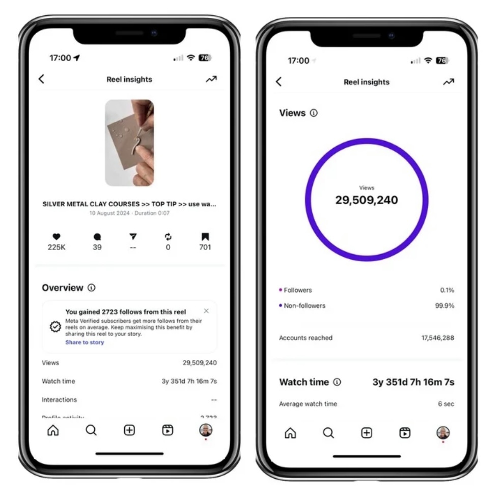 To date, I have 45 reels with over 1 million views. One has 29.5 million views, and counting. It has over 224,000 likes and I've gained 2730 followers from just this one reel alone. Over 700 people have saved it.